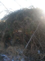 最初はこんな感じでした。全部バラで覆われています。一見どうなっているか分かりません。中にビニールハウスのような形の物が微かに見えます。